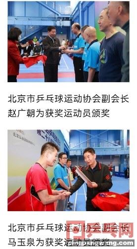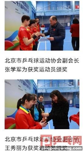 第四名:王明泽女单70岁组第一名:罗振繁女单61-70岁组第一名:徐桂珍女单51-60岁组第一名:曾美华第二名:张平女单31-50岁组第一名:赵璐第二名:赵育杰女单20-30岁组第一名:郭心怡第二名:颜伊萌城区组团体成绩男子61-70岁组第一名:天航瑞晨一队第二名:天航瑞晨二队男子51-60岁组第一名:北京乒乓球旅行网队第二名:西城乒协队男子31-50岁组第一名:石化飞翔一队第二名:本家TTC队男子20-30岁组第一名:北京环卫集团队女子61-70岁组北京农优队女子51-60岁组吉祥赛场七姐妹队女子31-50岁组勇往直前队女子20-30岁组北京环卫集团队