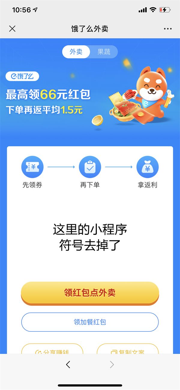 要实现点外卖省钱,我们主要也是通过外卖公众号、外卖小程序及一些返利APP来实现的,那我主要用的就是这个,“大家看我,看我,再看我,就帮你省钱了”。